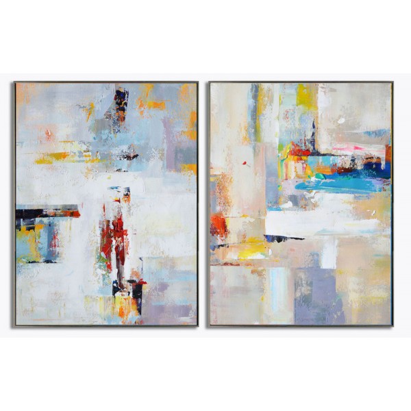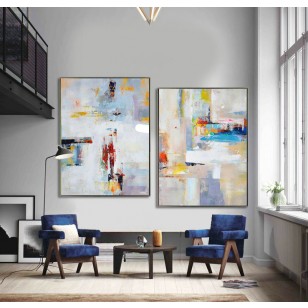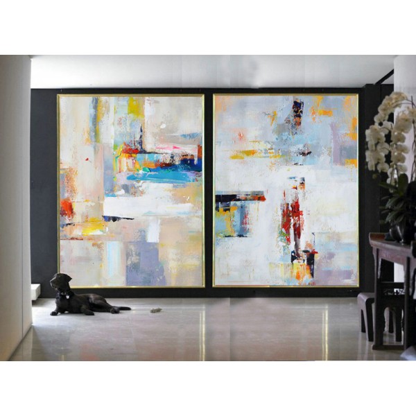 Set Of 2 Large Contemporary Painting, Abstract Canvas Art, Original Artwork, Blue, red, yellow, orange - By Leo